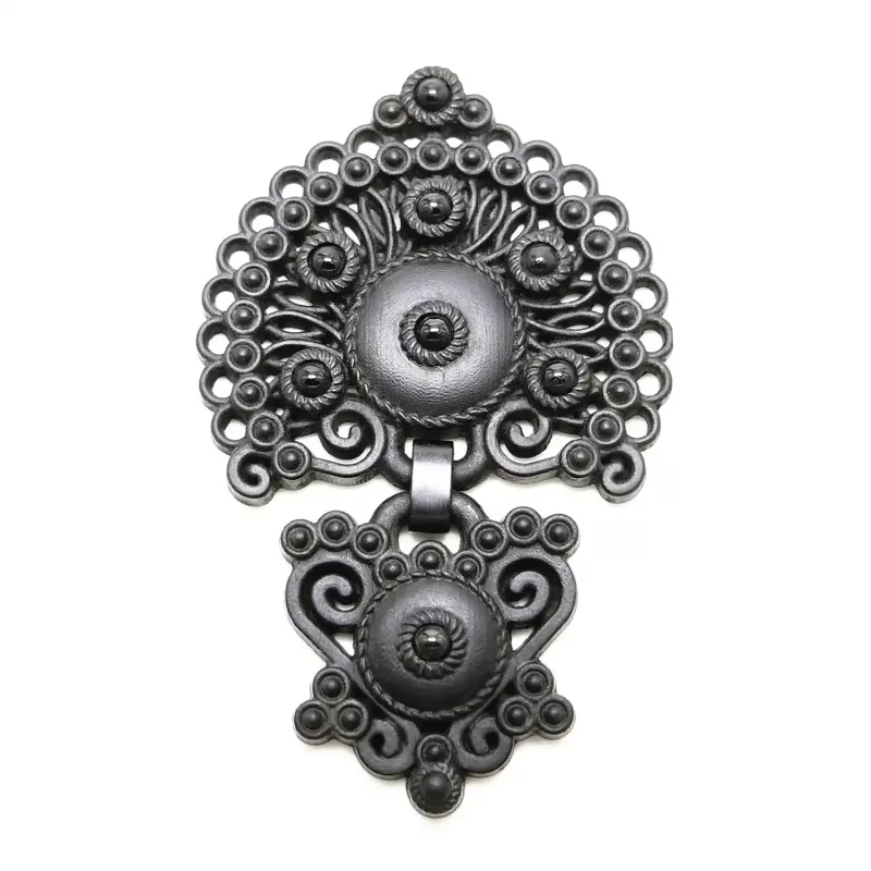 Feito de madeira de ébano, incrustacións de turmalina, ferraxes de aceiro lacado e latón.